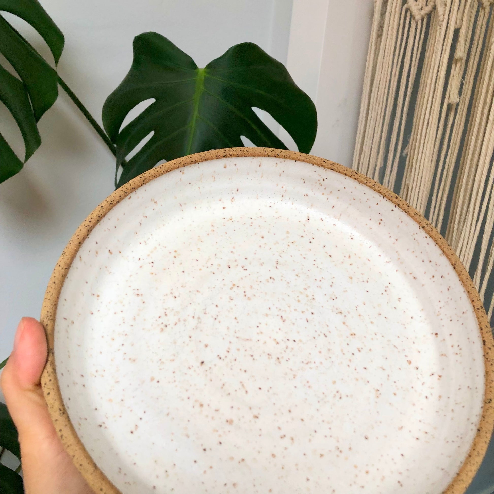 "Elevate your dining experience with this exquisite speckled clay plate, expertly handcrafted by Moon Pottery. The white glaze finish provides a stunning contrast to the earthy tones of the clay, making every meal a visual feast. Ideal for showcasing your culinary creations, this plate's unique speckled pattern and artisanal charm add a touch of sophistication to any table setting. Lovingly made by a local artist in Los Angeles, it's not just a plate—it's a piece of art."