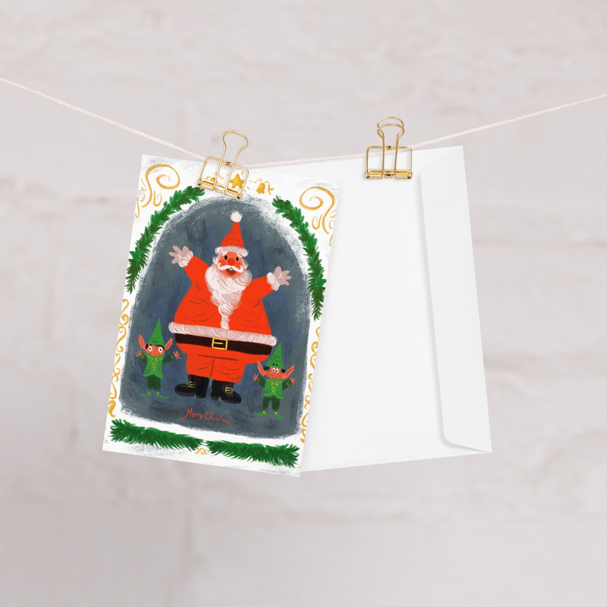 "Santa and Elf Christmas Card - Hand-Drawn by Leo Matsuda | Unique Holiday Greeting"