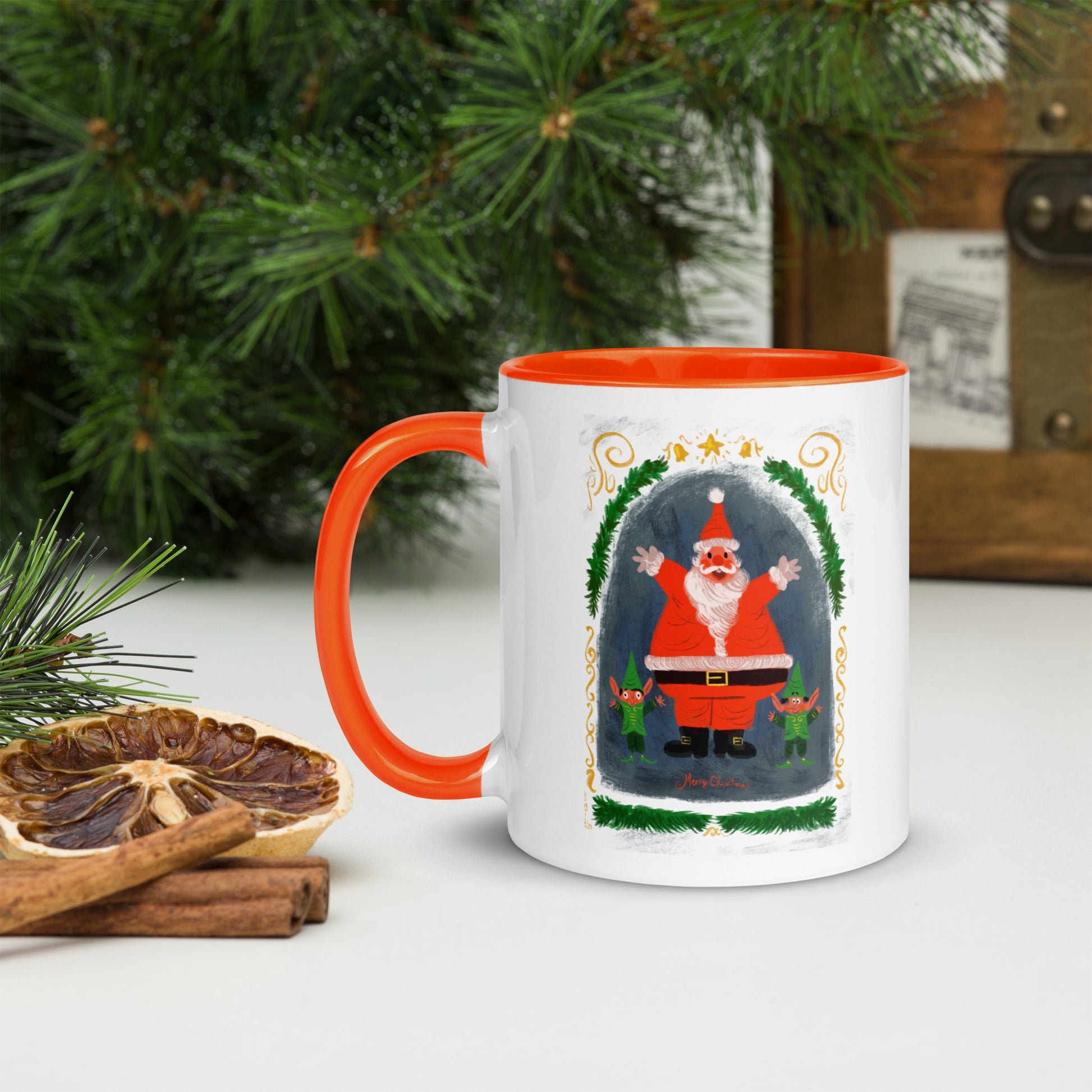 "Santa and Elves Mug with Color Inside - Hand-Drawn by Leo Matsuda | Festive Christmas Mug"